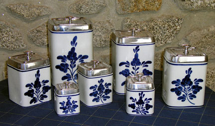 Seven Piece Cannister Set Pewter and Porcelain