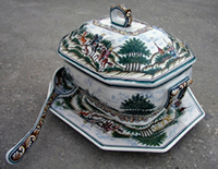 The Octagonal shape of the Tureen and Platter are beautifully repeated in the shape of the coordinating plates and soup bowls.