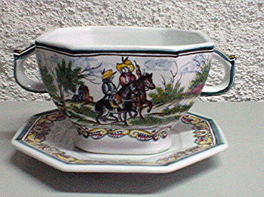 Set of Four Hunt Scene Earthenware Octagonal Soup Bowls with Plates